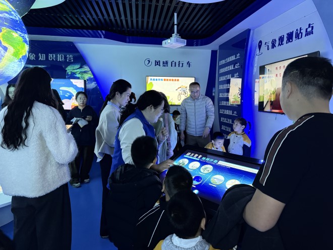 随后,大家移步神木气象科普馆,开启了一场寓教于乐的科普之旅。神木气象科普馆主要分为走进气象、气象历史、趣味气象、VR体验和雷电通道等七大板块,孩子和家长们认真听着工作人员的讲解,体验模拟人工增雨、气象知识问答、风感自行车等小游戏,参观气象仪器展区,感受一代代气象人自力更生、艰苦奋斗的成长历程,并通过VR眼镜身临其境感受暴雨、大风、泥石流等自然灾害天气,现场气氛活跃,孩子们在游戏和讲解中了解神木气象历史,感受科学魅力。