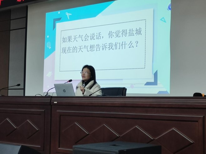 活动最后也是本次研学的重头戏,江苏省科技传播专家、盐城市气象台台长周宏伟,为同学们带来了一场生动的气象科普讲座《气象初探——盐城天气密码》。讲座围绕盐城常见的天气现象、灾害性天气的防范,以及气候变暖、低碳生活等内容展开。周台长通过生动的语言和案例引导同学们掌握气象知识、了解气候变化,并鼓励大家从日常生活做起,提高防灾减灾意识。
