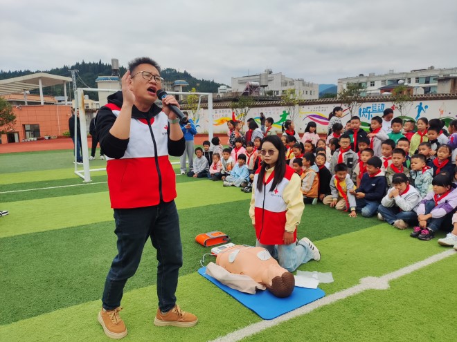 急救守护,筑牢生命防线:县红十字会带来的急救自救互救知识培训,则为孩子们上了一堂珍贵的生命安全教育课。专业救护人员通过模拟演示、手把手教学等方式,向学生们传授了心肺复苏的基本要领、创伤包扎的正确方法、异物梗阻的应急处理以及常见意外伤害的初步应对措施。孩子们认真聆听,踊跃参与实操练习,初步掌握了在关键时刻保护自己、帮助他人的基本技能,增强了风险意识和人道救助精神。