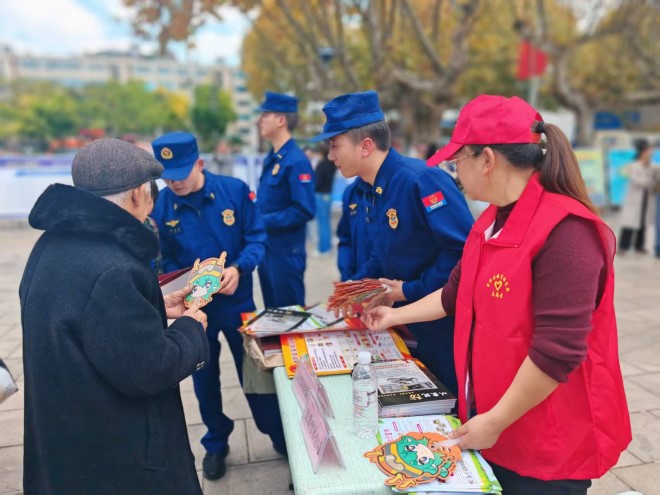 初冬的金城广场,阳光和煦,人流如织。活动在庄重而热烈的气氛中拉开帷幕。现场设立了多个咨询展示区,通过消防器材装备展示、消防安全知识展板讲解、发放宣传资料、现场答疑解惑等多种方式,向过往群众普及消防安全知识。消防官兵现场演示了灭火器、消防栓等常见消防设施的正确使用方法,并邀请群众亲身体验,掌握初期火灾扑救技能。生动的讲解和直观的演示吸引了大量市民驻足观看、积极参与。