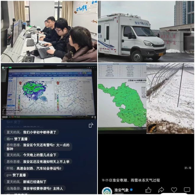直播特别设置连线环节,淮北市气象学会秘书长夏网萍与中华保险淮安中支农险科科长王宝鑫,在淮高镇大福村田间地头分享“气象+保险”联动服务实况,解读低温雨雪对农业的影响;淮阴区气象局华梦婕则介绍当地降雪实况、预警发布及服务情况,同步给出出行提醒。