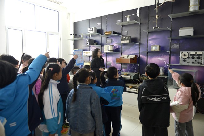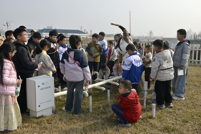 在“小小气象观测员”实践环节,小学生们在工作人员带领下,站在风向风速计旁学习辨别风向的方法,亲手操作人工观测设备测量降水量,并通过百叶箱中的温度表记录当日气温,沉浸式体验了气象观测的严谨与趣味。