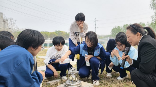 学生们亲手操作雨量观测设备