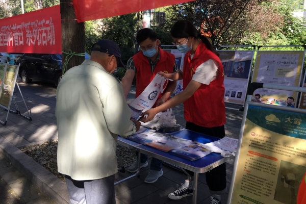 图为:全国科普日期间,涿州市气象科普志愿者在东兴社区开展气象防灾减灾科普宣传。摄影 穆梦伟