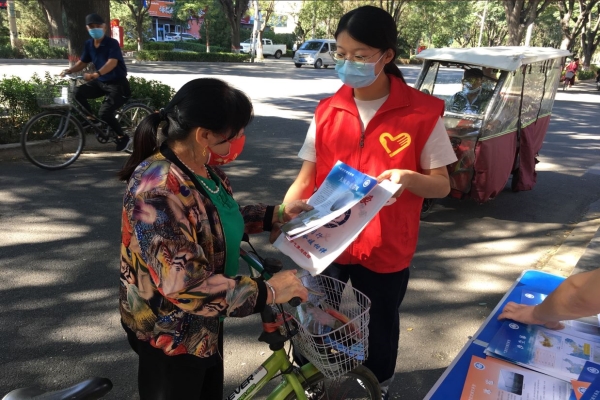 图为:全国科普日期间,涿州市气象科普志愿者在东兴社区向居民发放气象防灾减灾科普宣传材料。摄影 柳俊峰